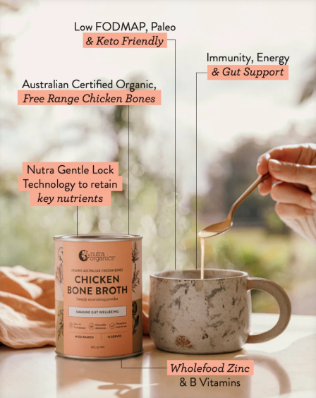 Often referred to as ‘chicken soup for the soul’, Our Chicken Bone Broth is naturally loaded with essential vitamins for immune support. Red Miso is made from fermented soybeans, and has a long history of use in Japanese culture for promoting gut health and immunity. Zinc is an essential mineral for supporting our immune system and also contributes to cell protection from free radicals. B Vitamins help our metabolism, assist with tiredness and fatigue, and B12 further supports immunity.