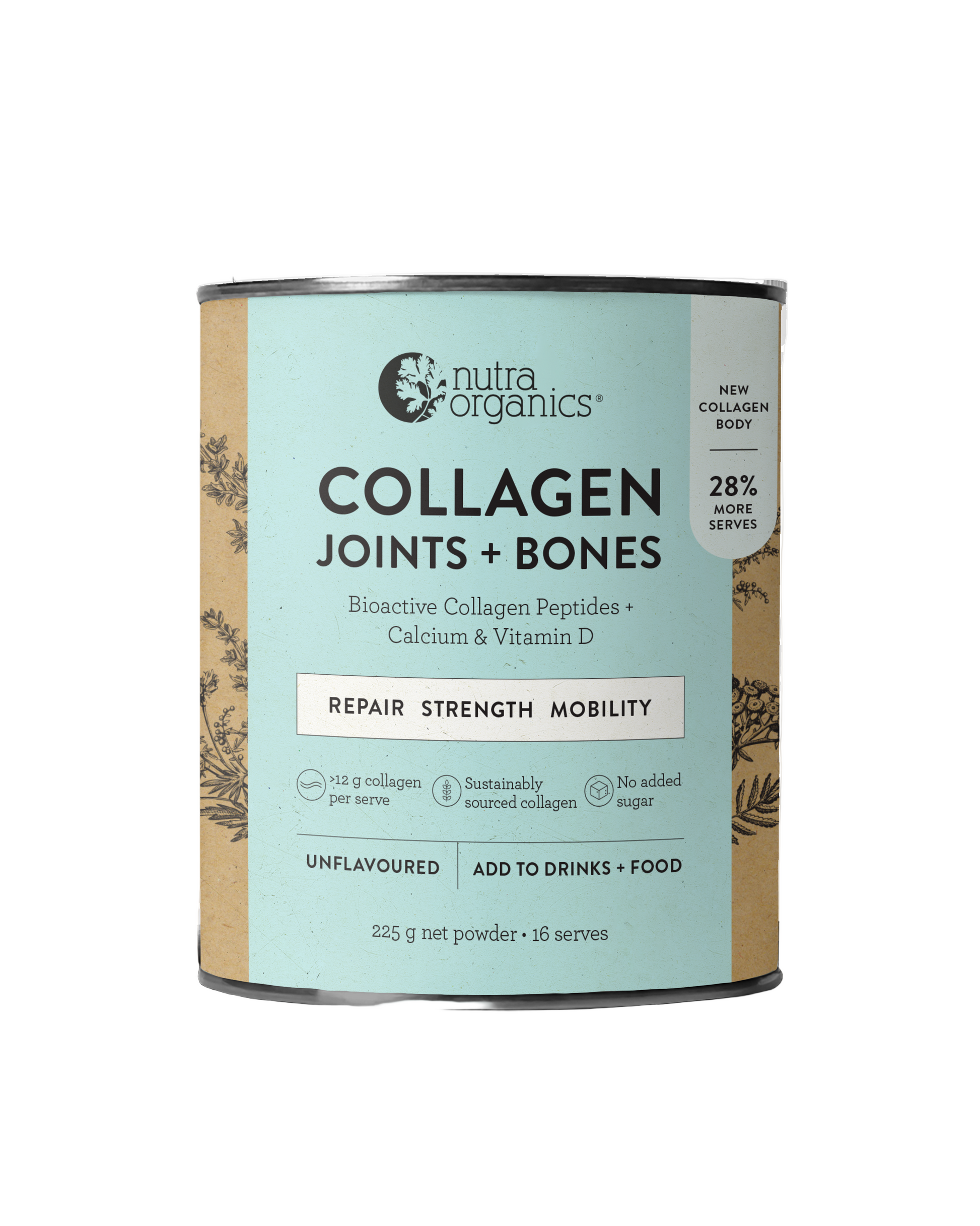 Collagen Body powder supports joint mobility, bone structure and gut health. A functional formulation of bioactive collagen peptides infused with vitamin D and C by Nutra Organics